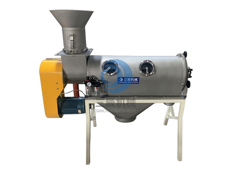 篩機由電機、機座、篩箱、進出料推進裝置等組成。物料由料斗經(jīng)螺旋輸送進入篩箱,分流葉片連續(xù)轉(zhuǎn)動,形成了物料在篩箱內(nèi)不斷的更新推進,使物料產(chǎn)生運動沖向篩網(wǎng),細料通過篩網(wǎng)落入成品倉,粗料繼續(xù)向前推進,在粗料口排出,從而達到理想的篩分效果。